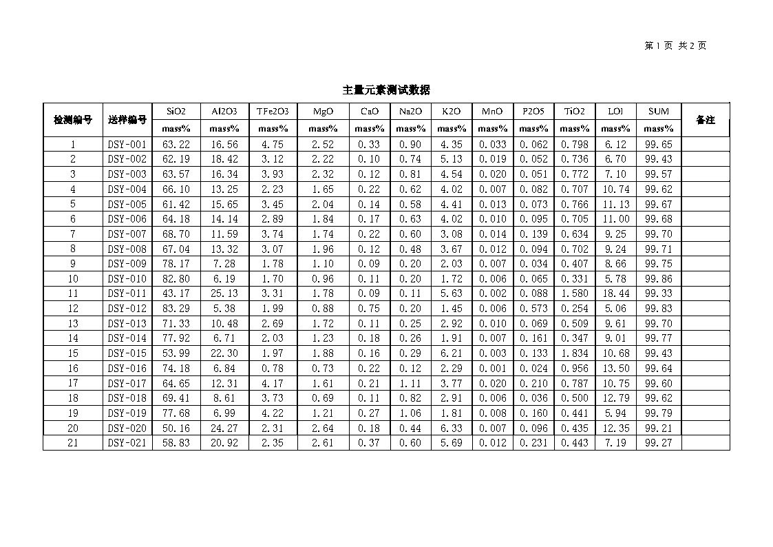 试料用无水四硼酸锂熔融,以硝酸铵为氧化剂,加氟化锂和少量溴化锂作助熔剂和脱模剂。试料与熔剂的质量比为1:8。在熔样机上于1150℃~1250℃熔融,制成玻璃样片。在X射线荧光光谱仪上进行测量,除镍、铜、锶和锆用康普顿散射线作内标校正基体效应外,其余各分析元素均用理论α系数校正元素间的吸收-增强效应,根据荧光强度计算主、次成分的量。详细实验步骤参考GB/T 14506.28-2010《硅酸盐岩石化学分析方法第28部分:16个主次成分量测定》。