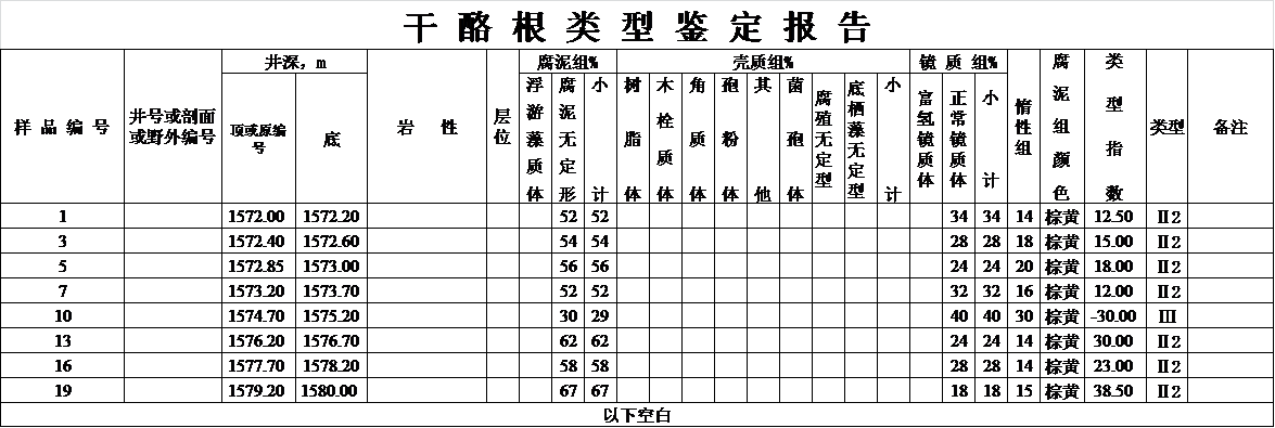 以煤岩学分类命名原则为基础,利用具透射光和反射荧光功能的生物显微镜,对沉积岩中干酪根显微组分进行鉴定,并对各显微组分百分含量进行定量统计,根据各显微组分不同的加权系数计算出类型指数(TI),从而将干酪根划分为三类四型(I型、II1、型、II2型和III型),以确定有机质类型。